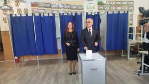 Preşedintele AUR, George Simion, a votat, duminică, la o secţie din Mogoşoaia, împreună cu...