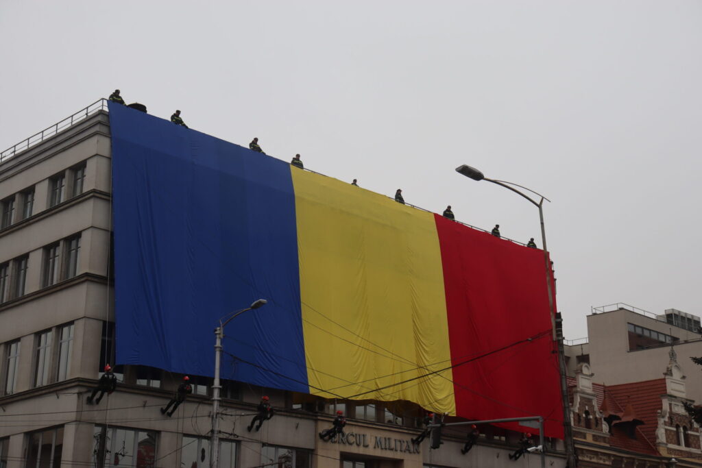 În debutul manifestărilor de aici, în timpul intonării Imnului Național, pompieri din cadrul ISU Cluj au desfășurat un tricolor de mari dimensiuni pe întreaga faţadă a Cercului Militar.