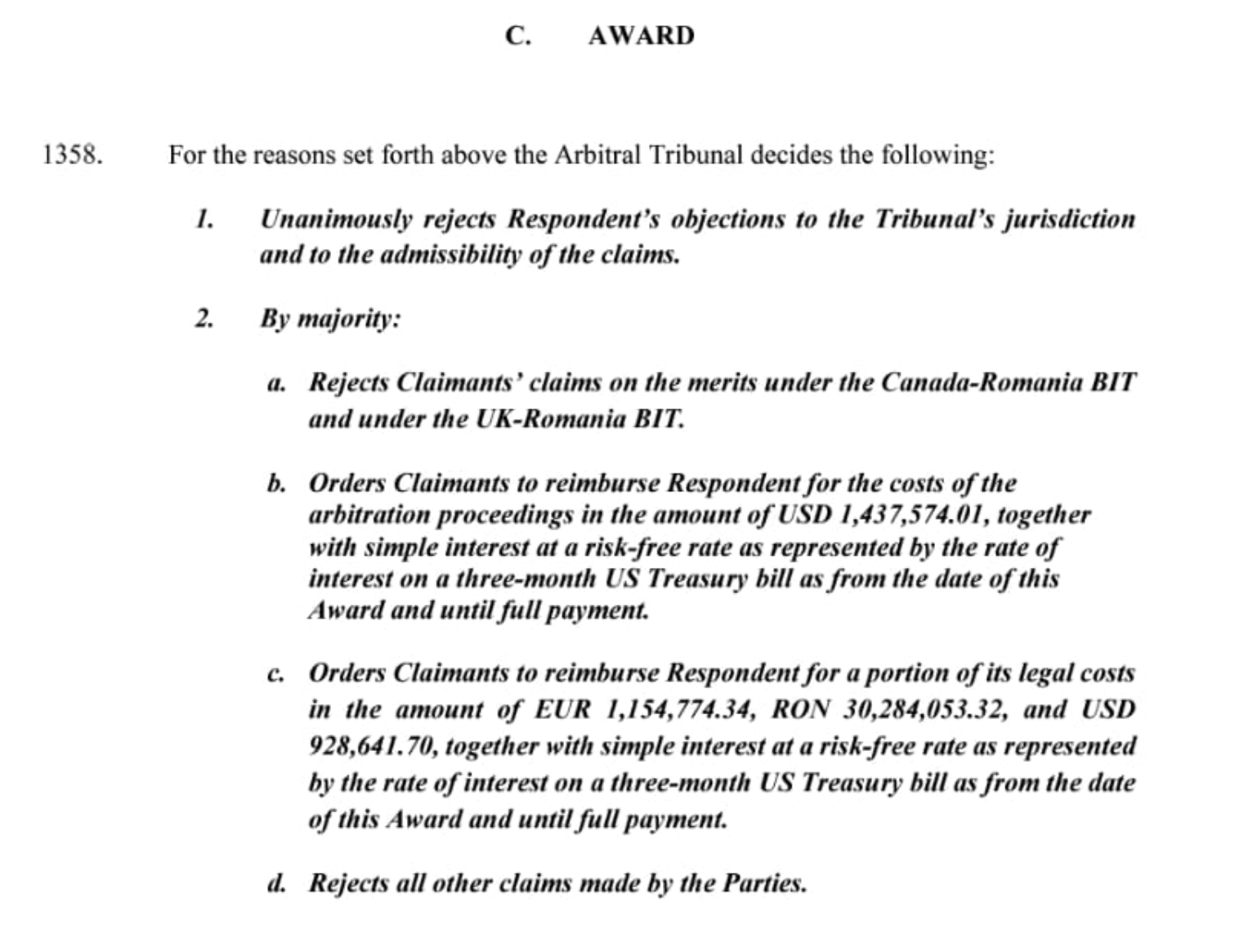 „România dorește publicarea integrală a hotărârii arbitrale. Prin urmare, dacă tribunalul arbitral va redacta hotărârea arbitrală fără a face trimitere la informațiile confidențiale aflate în posesia sa, atunci hotărârea arbitrală va deveni publică în întregime și se va publica pe site-ul Centrului Internaţional pentru Reglementarea Diferendelor Relative la Investiţii (https://icsid.worldbank.org)”, a precizat Guvernul.