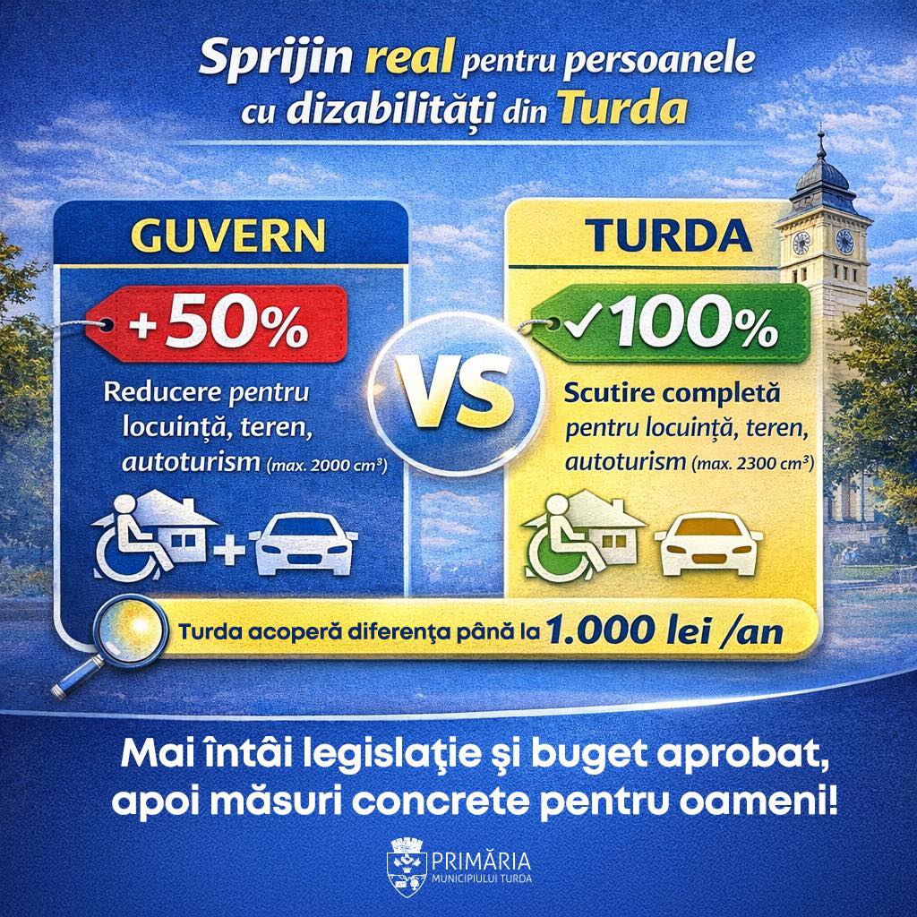 În prezent, cadrul național oferă reduceri de până la 50% pentru impozitul pe clădire, teren și pentru un autoturism de până la 2000 cm³ în cazul persoanelor cu handicap grav, respectiv 25% pentru cele cu handicap accentuat. Propunerea pentru municipiul Turda vizează acoperirea integrală a impozitului pentru locuința de domiciliu și terenul aferent, precum și o reducere de 100% a impozitului pentru un autoturism cu o capacitate cilindrică de până la 2300 cm³. Această facilitate completă s-ar aplica atât persoanelor cu handicap grav, cât și celor cu handicap accentuat, diferența față de plafonul național urmând să fie suportată de bugetul municipiului Turda, în limita a 1.000 lei pe an pentru fiecare beneficiar.