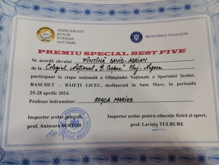 Echipa de baschet a Colegiului Național „George Coșbuc” din Cluj-Napoca a fost distinsă cu...
