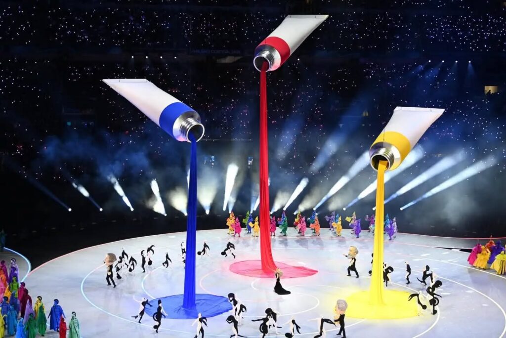 Imnul Italiei a fost interpretat simultan de Laura Pausini la Milano şi de un cor montan la Cortina d’Ampezzo, în timp ce drapelul ţării gazdă se înălţa pe catarg.